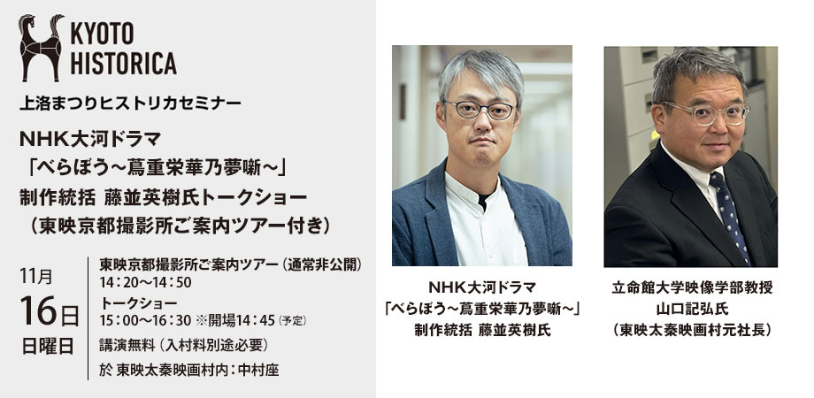 名称 | 上洛まつりヒストリカセミナーNHK大河ドラマ「べらぼう~蔦重栄華乃夢噺~」制作統括 藤並英樹氏トークショー(東映京都撮影所ご案内ツアー付き) |