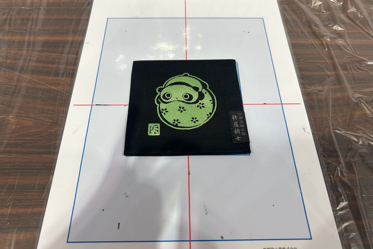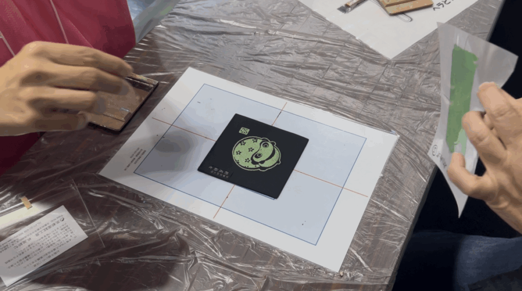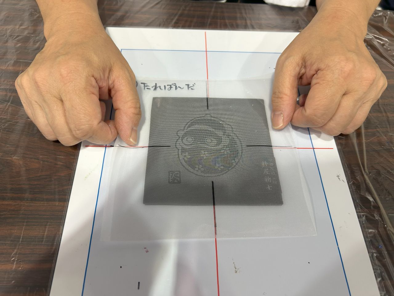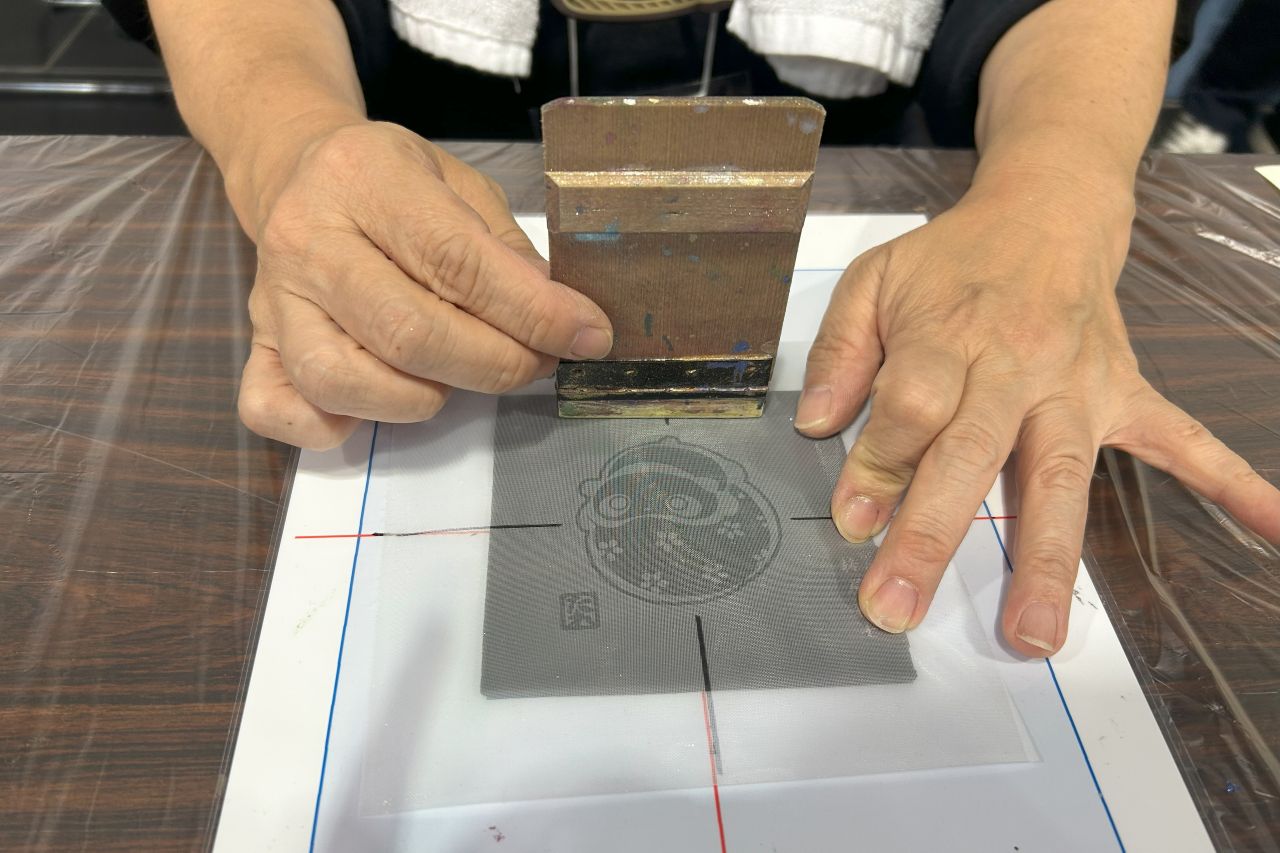 体験では“京黒紋付染(きょうくろもんつきぞめ)”の技法が使われたアイテムや黒地のアイテムに、 推しのキャラクターを型刷りすることができます。