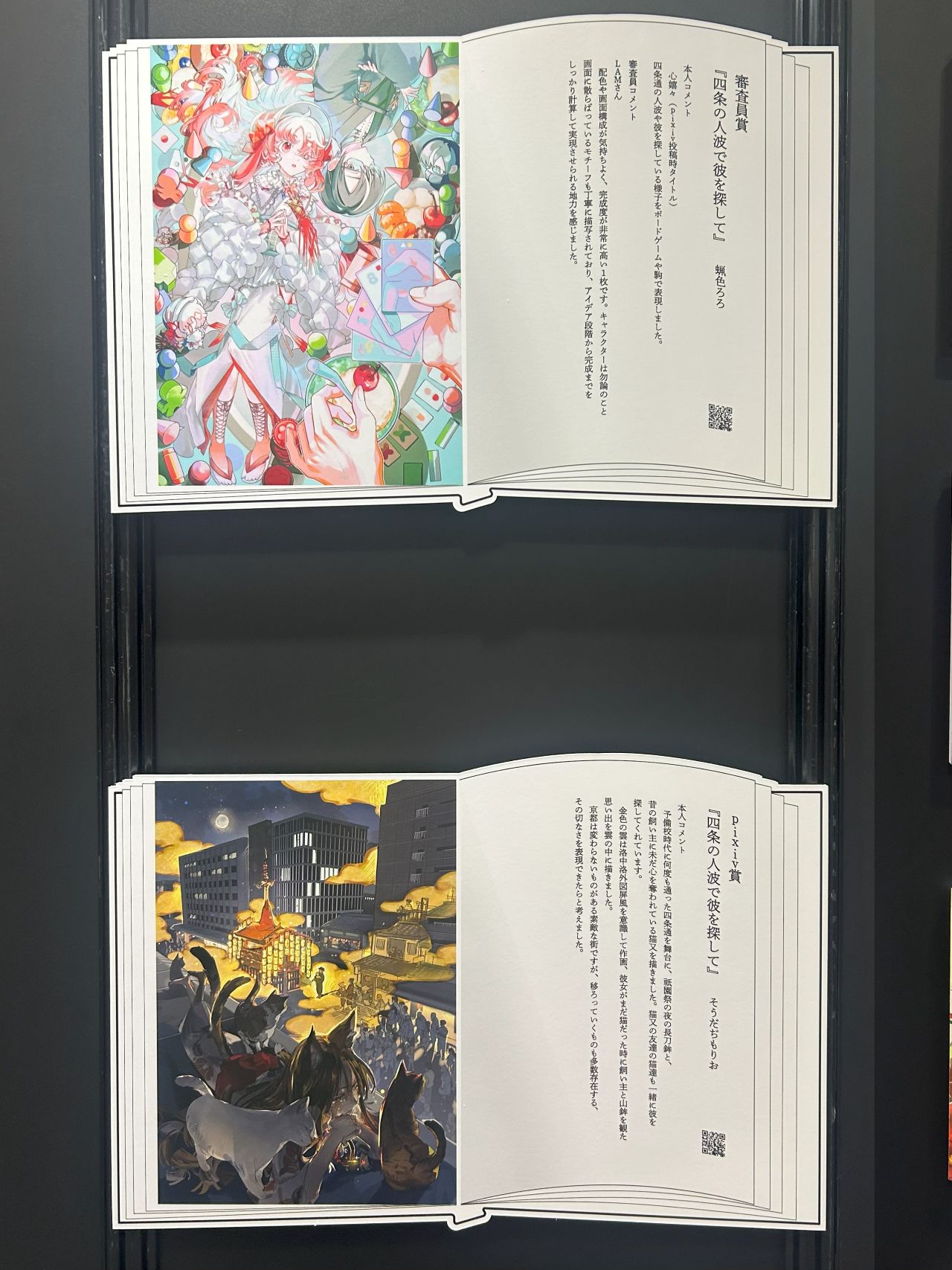 審査員賞を受賞した蝋色ろろさんの作品と、Pixiv賞を受賞したそうだぢもりおさんの作品はどちらも「四条の人波で彼を探して」ですが…同じテーマで描いたとは思えないほど異なる世界観の作品が誕生しました。