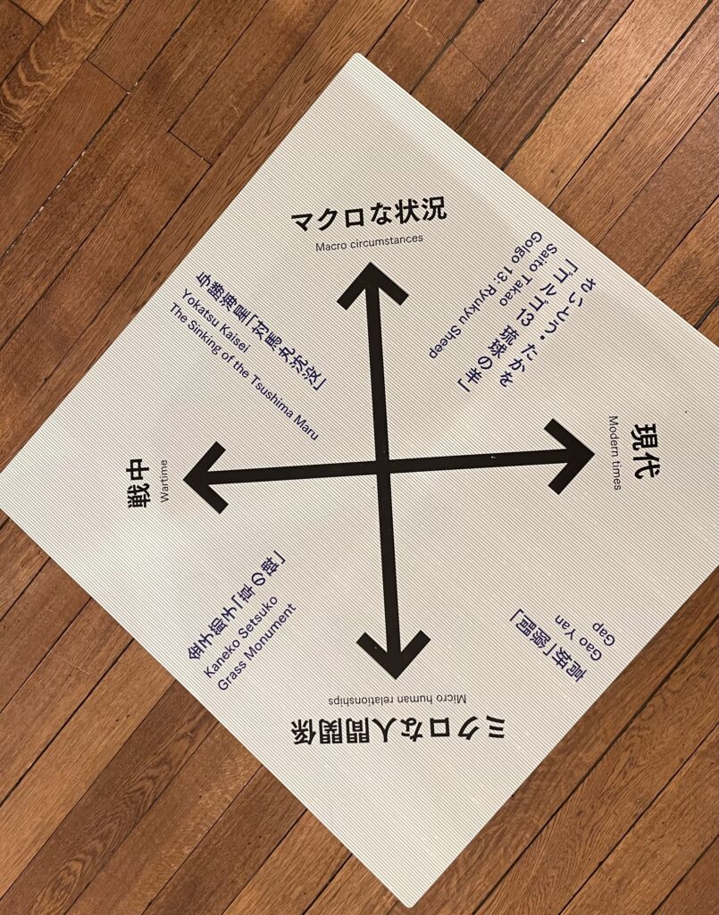 “4象限マトリクス”とは対照的なふたつのキーワードの軸を設定し、もうひとつの軸と交差させ、その間に該当する作品を配置する展示方法です。伊藤さんにこの展示方法のねらいについてたずねました。