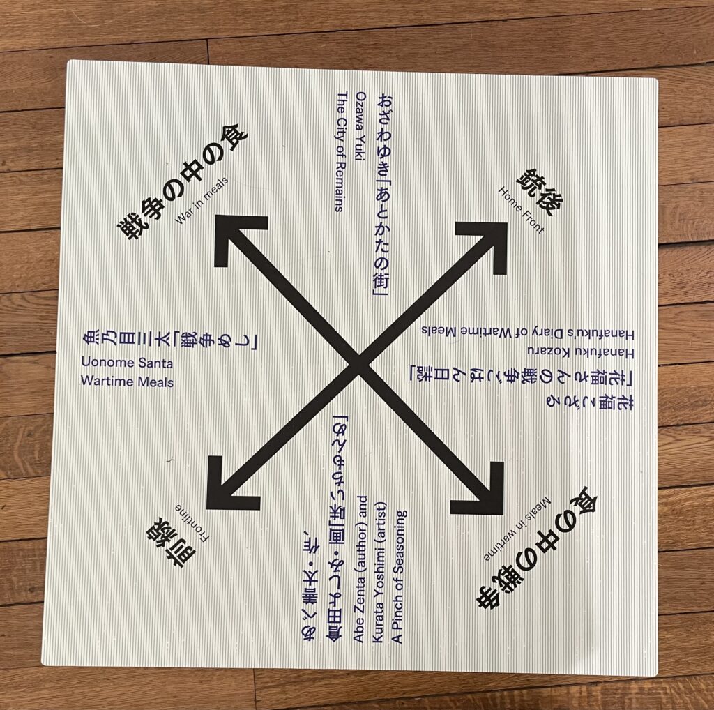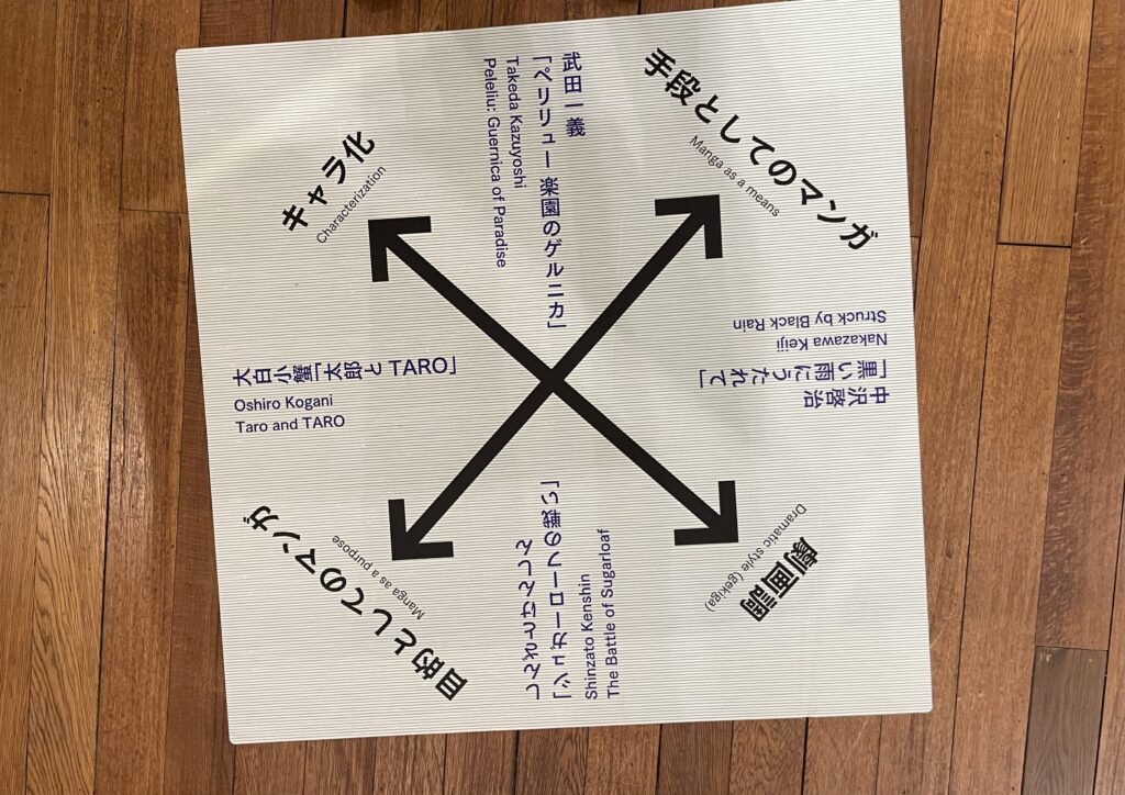 ギャラリーの中央には今回新たに加えられた4つのテーマ「食」「“外国”の戦争」「マンガの表現」「新・沖縄」が展示されていました。テーマ毎に床にマトリクスが設置され、四方に4つのマンガ作品の1シーンが垂れ幕のように吊るされていました。外から見るとタテに長い直方体を思わせる形で、外側には各作品の説明文が記載されていました。実際に垂れ幕の中に入り、マトリクスの上に立ってみると、四方をマンガに囲まれる形で鑑賞できるので、個々の作品によって作風や表現方法が大きく違うこと、テーマ毎に歴史や流行があることがわかりました。