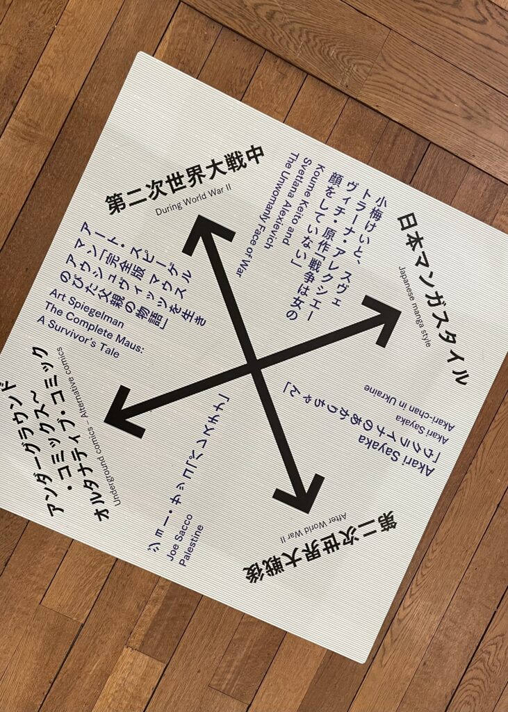 「マンガと戦争展2」の展示は、“4象限マトリクス”というユニークな展示方法で見る戦争マンガと、「今読むべき/鑑賞すべき戦争マンガ」と題した、沖縄出身の2人の作家による原画展で構成されています。この記事では本展を企画した伊藤遊さん(京都精華大学国際マンガ研究センター特任教授)からお聞きした話を折り込みながら、実際の展示の様子や、来館するならぜひチェックしてほしいポイントを紹介します。