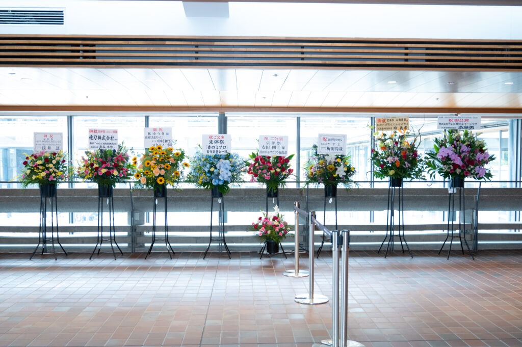 会場に入ると、まず目に入ったのは、祝「京伴祭」と書かれた大きなスタンド花の列。入口からすでに多くの来場者で賑わっていて、イベントの熱気が伝わってきます。