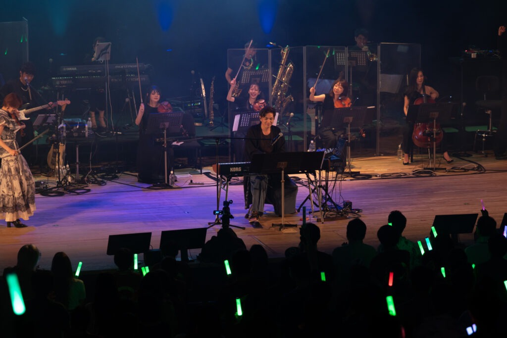 再びMCの飯大郎さんと鈴木さんが登場し、和田薫さんのステージを振り返りつつ犬夜叉トークで盛り上げます。余韻に浸る会場に残ったのはDJ TAIJIさん。次の出演者を想起させるように『FAIRY TAIL』の楽曲をゆるやかに流し、さらに『BORUTO』のCMが映し出されると、観客の期待感は一気に高まります。暗転とともに「京伴祭!」の掛け声と手拍子が響き、舞台には普段より多い演奏者の姿。そして肩からキーボードを下げた高梨康治さんが華やかに登場すると、会場は総立ちの大歓声に包まれました。