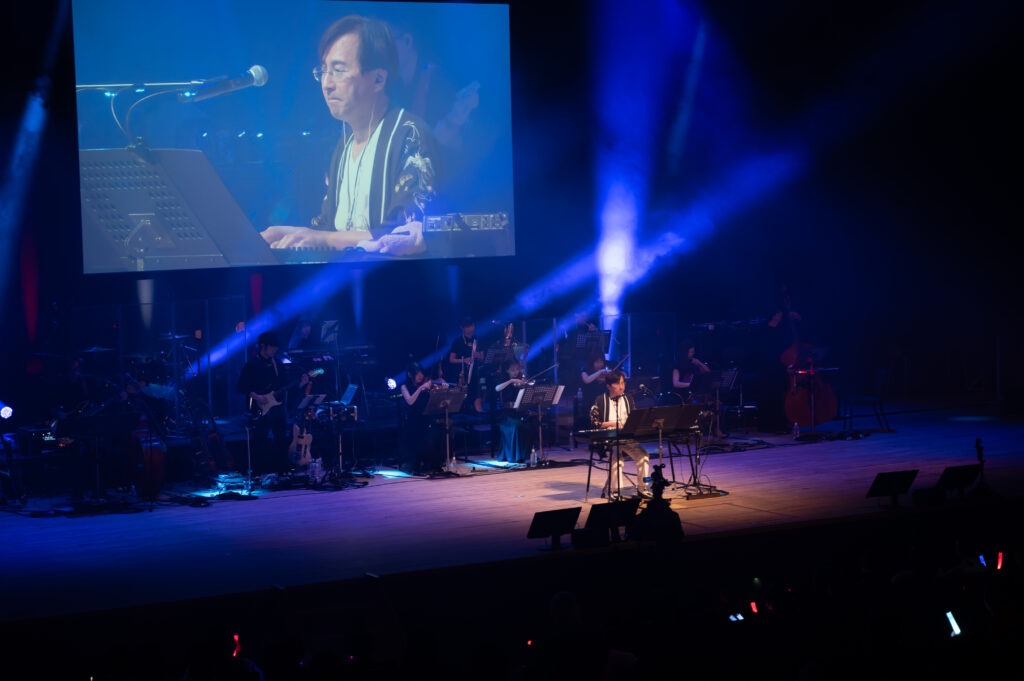 1曲目は1996年放送『ゲゲゲの鬼太郎(第4期)』より「総力戦」「レクイエム~魂の安らぎ」のメドレー。スクリーンには当時の映像が映し出され、しっとりとした雰囲気に。和田さん自身も「ゆっくり、のんびり、楽しんでいただけたら」と語り、観客も耳を傾けます。