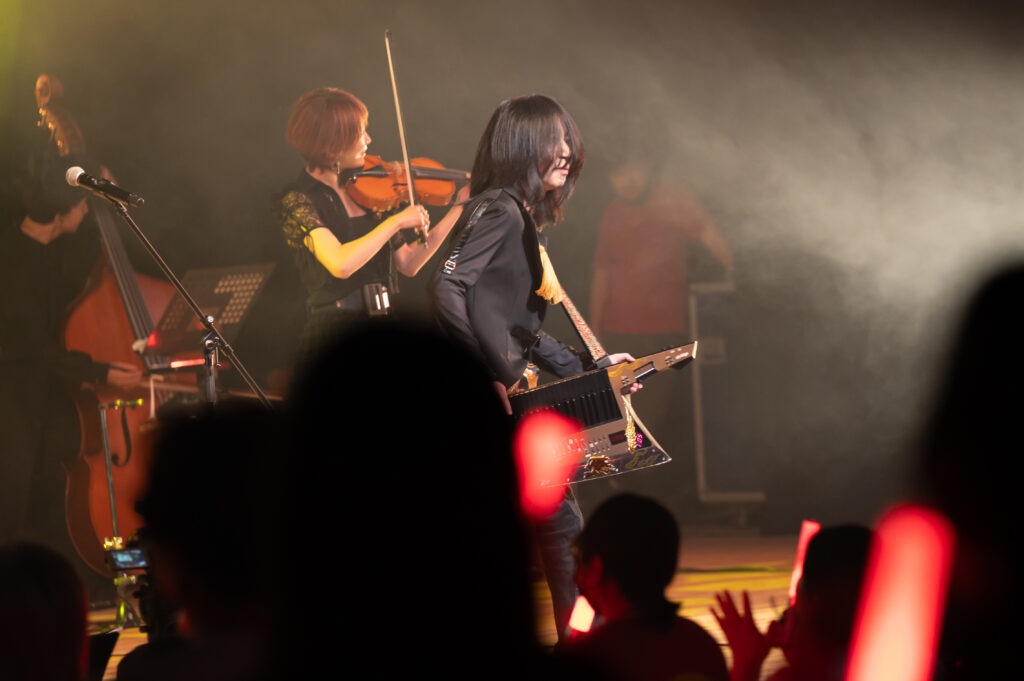 メンバー紹介の後、高梨さんは「いよいよラストですね。続きはまた……次はいつだろ、、まぁでも、京伴祭はまたやります、どっちにしろ」と、まさかの出演確定を宣言。観客は大歓喜に包まれます。最後を飾ったのは「形勢逆転」。コンバスの長谷川さんやJunoさんもペンライトを振りかざして盛り上げ、エアロフォンやヴァイオリンのソロに鳥肌が立ち、落ちサビで旋律だけが浮かび上がる瞬間には、会場全体が息を呑みました。