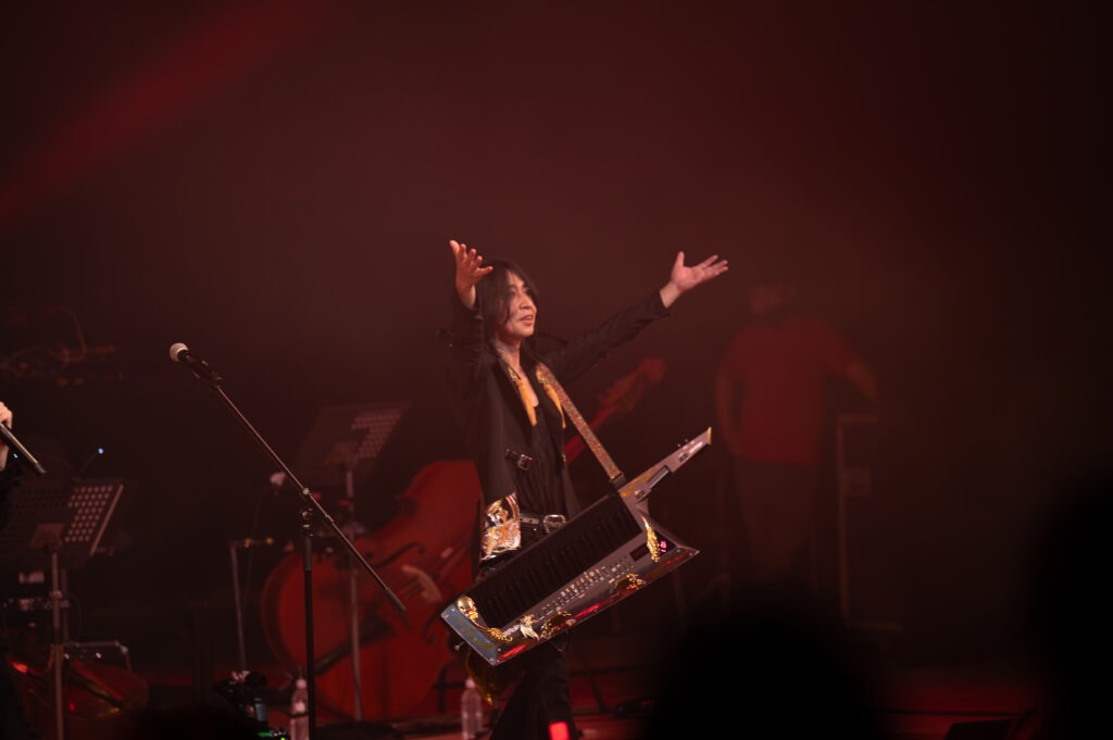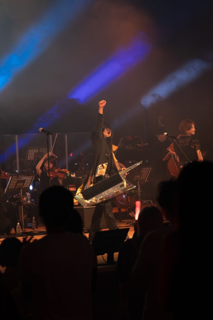 再びMCの飯大郎さんと鈴木さんが登場し、和田薫さんのステージを振り返りつつ犬夜叉トークで盛り上げます。余韻に浸る会場に残ったのはDJ TAIJIさん。次の出演者を想起させるように『FAIRY TAIL』の楽曲をゆるやかに流し、さらに『BORUTO』のCMが映し出されると、観客の期待感は一気に高まります。暗転とともに「京伴祭!」の掛け声と手拍子が響き、舞台には普段より多い演奏者の姿。そして肩からキーボードを下げた高梨康治さんが華やかに登場すると、会場は総立ちの大歓声に包まれました。