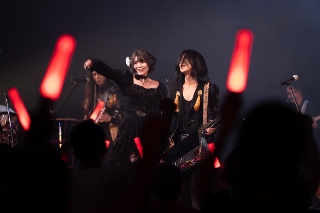 「ようこそ京伴祭へ。今年もみなさんに会えてうれしいです」と挨拶する高梨さん。黒を基調としたロック&ゴシック調の衣装に身を包んだメンバーたちは、統一感がありながらも個性が際立ち、ステージ全体の一体感と迫力を際立たせます。ヨーロッパ公演も共にしたボーカルのJunoさんとの掛け合いも軽快で、ステージはますます熱を帯びていきます。