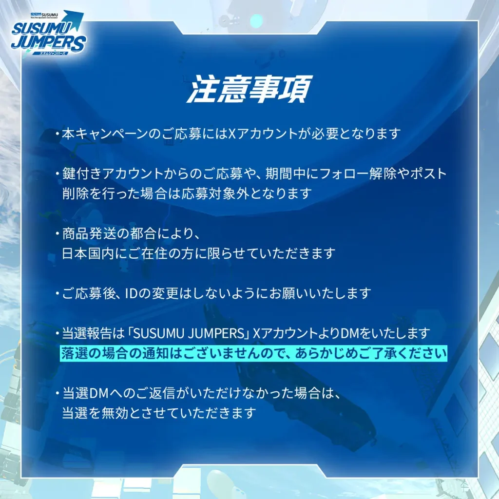 ・当選報告は「SUSUMU JUMPERS」XアカウントよりDMをいたします。落選の場合の通知はございませんので、あらかじめご了承ください