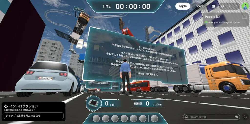 『SUSUMU JUMPERS』は、メタバースプラットフォーム「Spatial」上で開発された、ブラウザから手軽にプレイできるメタバースゲームです。