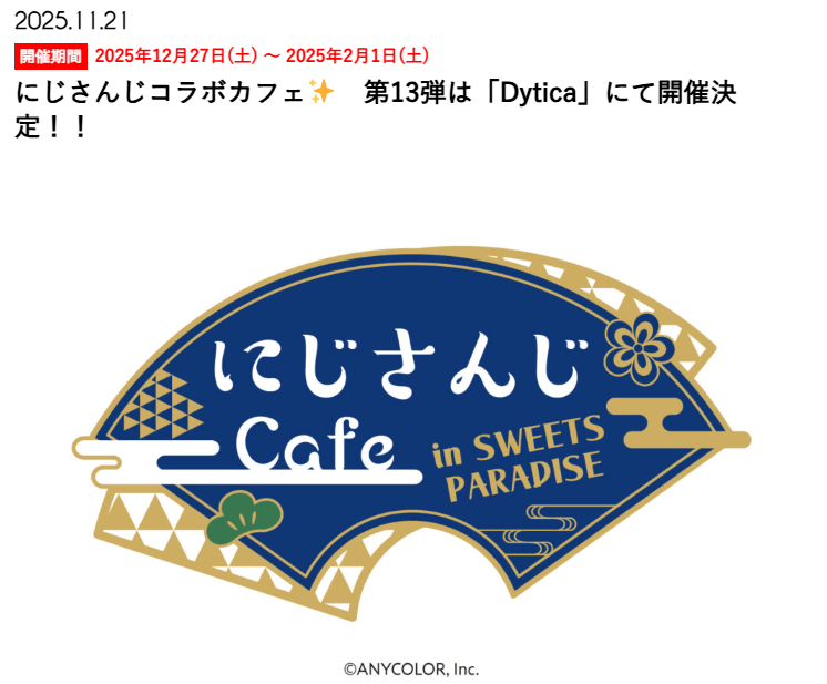 - 【京都コンテンツ関連情報】四条河原町店は12月27日から!にじさんじ×スイーツパラダイスのコラボカフェ開催!(開催期間:2025/12/27~2026/1/18)