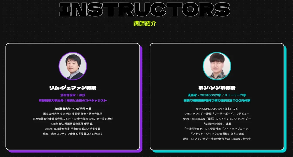 本イベントでは、韓国のWebtoon業界において最高峰の教育機関として知られ、数多くの人気作家や第一線のクリエイターを輩出する『青江(チョンガン)文化産業大学』のイム・ジェファン教授、ホン・ソンホ教授を招聘し、Webtoon産業とそのビジネスモデル、制作プロセスと演出について実践的な講義をしていただきます。