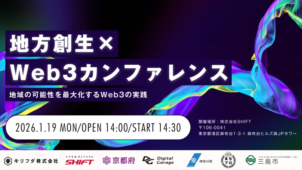 キリフダ株式会社(本社:東京都中央区、代表取締役社長:赤川 英之)と株式会社SHIFT(本社:東京都港区、代表取締役社長:丹下 大、以下「SHIFT」)は、2026年1月19日(月)に開催する「地方創生 × Web3カンファレンス:地域の可能性を最大化するWeb3の実践」の全セッション内容および登壇者を公開いたしました。京都府、神奈川県、三島市の事例をもとに、自治体がWeb3を取り入れる意義と、そこにある障壁について徹底討論します。