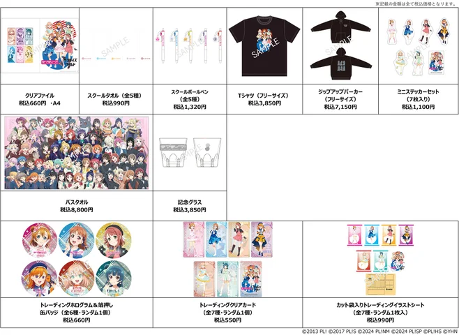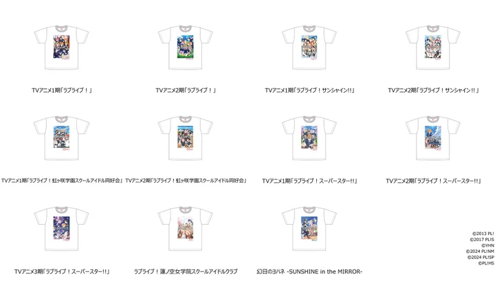 また、TOKYO店舗では「ラブライブ!シリーズ」フェアキービジュアルメンバーの各衣装の楽曲を店内BGMとして放送。さらに、各シリーズのポスタービジュアルを使用したオンデマンドプリントTシャツ11種を販売します。