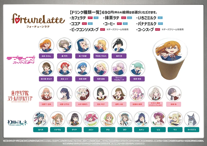 各「バンダイナムコ Cross Store」内のカフェでは、サンライズブランド作品のイラストをプリントした、ラテアートドリンク(690円/税込)を販売します。(サンライズワールド「ラブライブ!シリーズ」フェアにあわせて、各シリーズのメンバーがプリントされた新柄全60種をフェア期間限定で販売) また、ラテ1杯購入毎に、描き下ろしキービジュアルメンバーが、それぞれデザインされたコースター1枚が購入特典としてプレゼントされます。(ランダム配布)