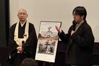 1月31日(土)京都シネマにて、蔦 哲一朗監督と本作にご協力いただいた臨済宗 大本山 妙心寺退蔵院 松山大耕副住職がトークイベントを行いました。「十牛図」に象徴される<禅>の世界は本作の着想に多大な影響を与えています。松山副住職は、作品における禅的思想の道標として、作中「十牛図」の詩も筆されています。「なぜ十牛図は馬ではなく牛なのか。馬はまっすぐ走るが、牛は迷う」とお話があり盛り上がりました。