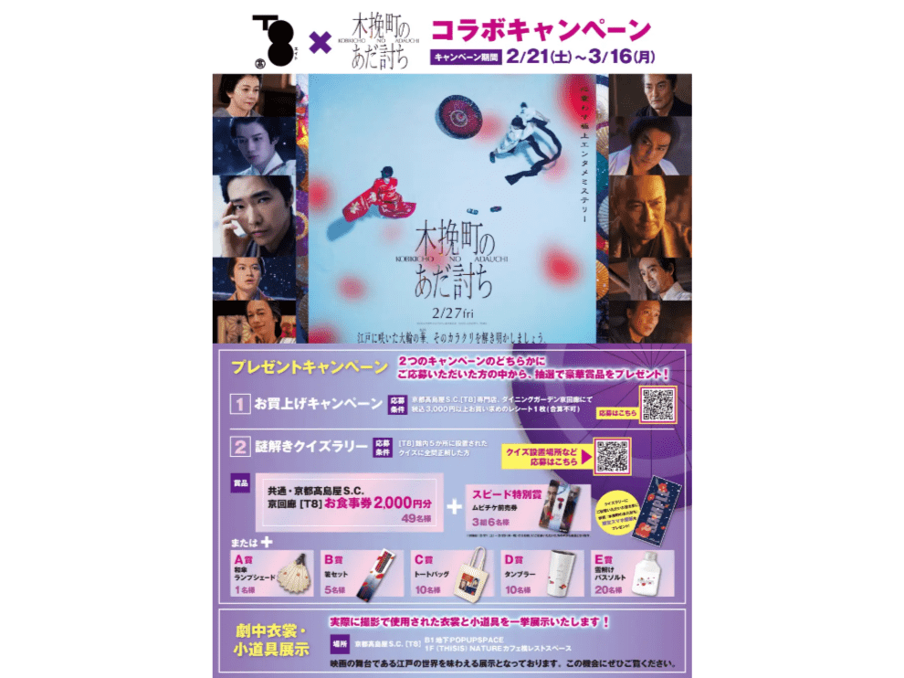 - 【映画分野イベント情報】役者が百貨店館内を「花魁道中」で練り歩き!京都髙島屋S.C.×映画『木挽町のあだ討ち』謎解きや衣装展開催!(開催期間:2026/2/21~3/16)