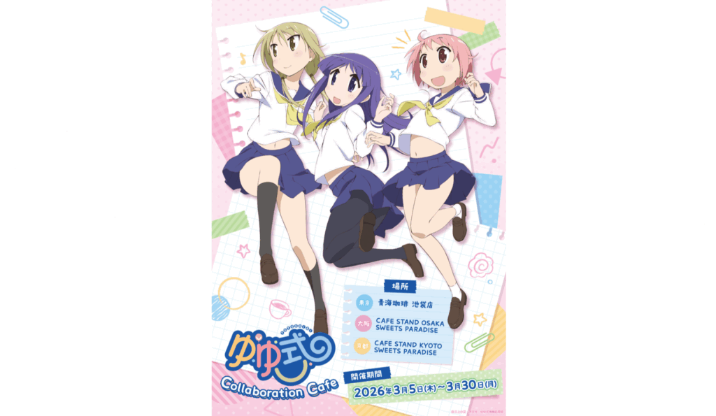 三上小又先生による大人気4コマ漫画を原作とし、今もなお多くのファンに愛され続ける日常系アニメ『ゆゆ式』。その世界観を存分に楽しめるテイクアウトコラボカフェが、2026年3月5日より「CAFE STAND KYOTO SWEETS PARADISE(京都)」および大阪の同店舗にて期間限定でスタートしました!京都の街なかで、情報処理部の3人と一緒に癒しのひとときを過ごしてみませんか?