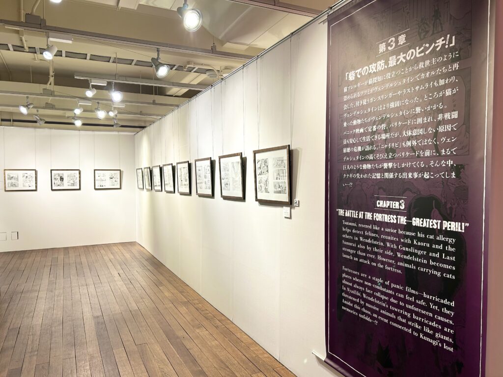 マンガの原画とあわせて作者のプロットを展示する「逃げろ!可愛い猫が来た!」からはじまり、「仲間を増やし、チームで抗え!」「砦での攻防、最大のピンチ!」、アフレコ台本といったアニメ関連資料展示、本展のために撮られたオリジナル映像の上映と、見ごたえある内容となっています。