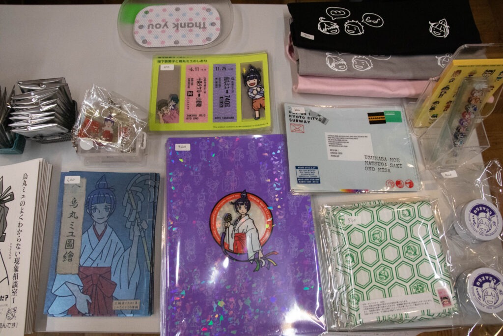 So much merch for the Kyoto International Manga Museum’s PR character, Miyu Karasuma! Work by たたみもち and 松尾橋ぷるこ.