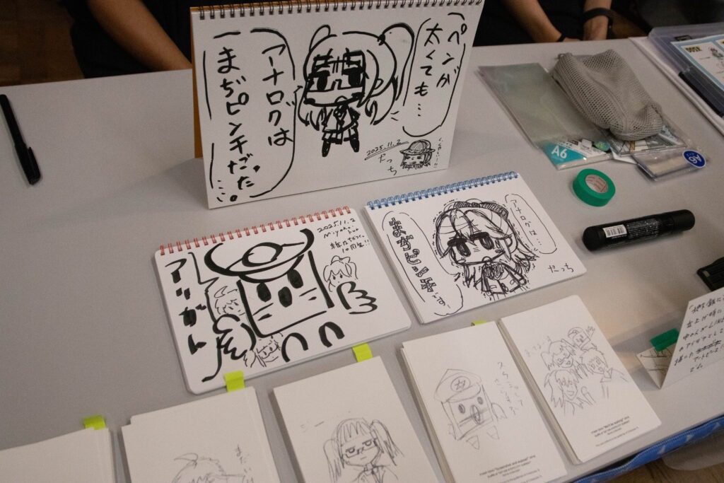 This photo shows a skeb (sketchbook), a classic part of doujinshi market culture. It is when an attendee leaves their sketchbook at a creator’s booth to get an illustration drawn for them. You could see attendees at Chikatsuku9 requesting drawings of their favorite characters.